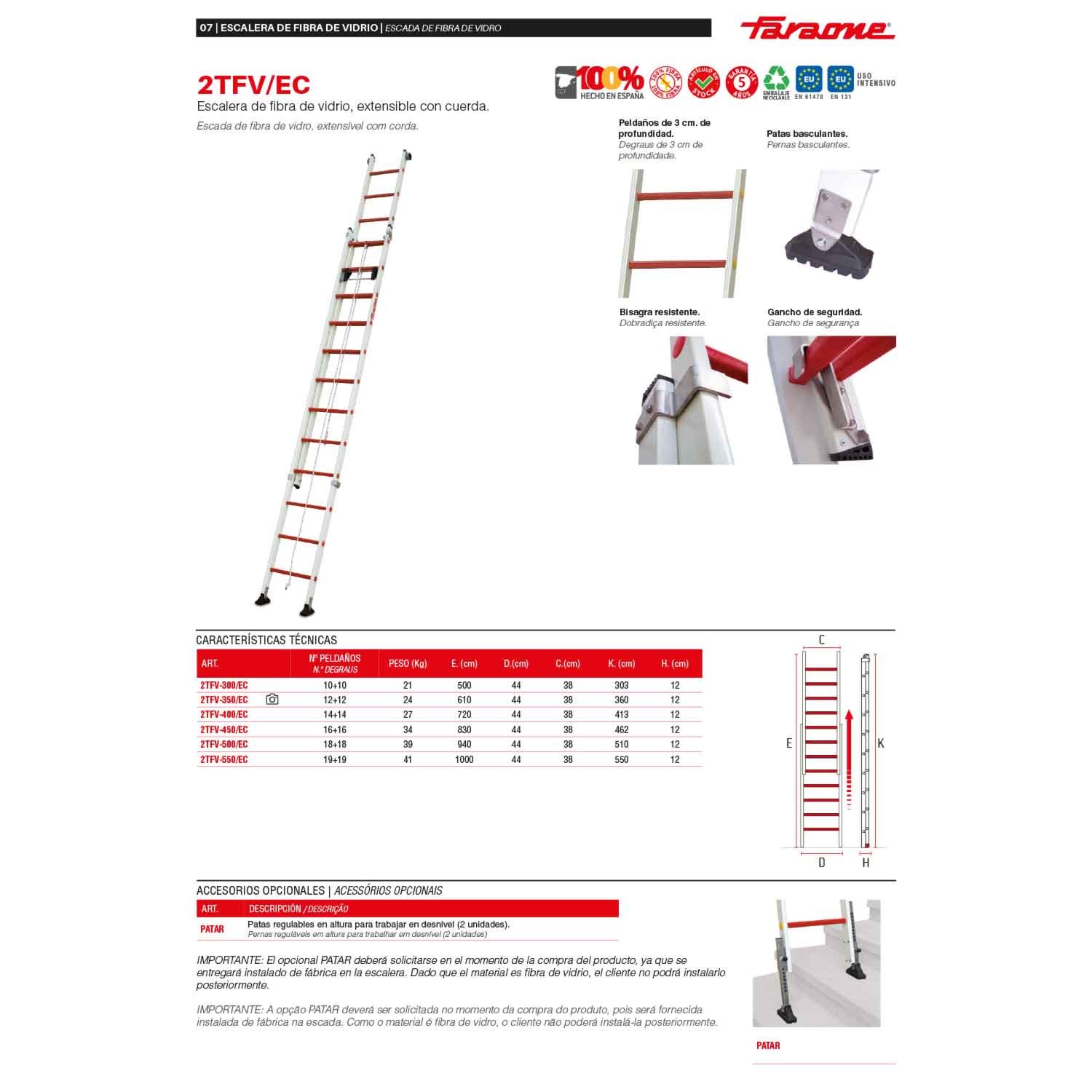 L'échelle 2TFV/EC est composée de 2 sections en fibre de verre accouplées à l'aide d'un système d'extension par corde, idéal pour régler la hauteur, et de pieds à bascule pour faciliter son déplacement. Elle est idéale pour les travaux présentant des risques électriques.