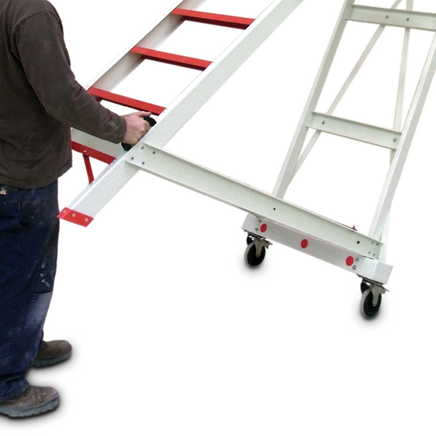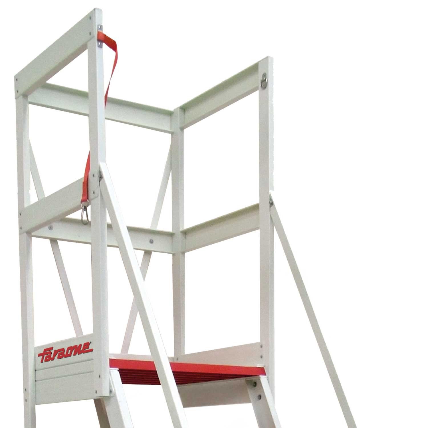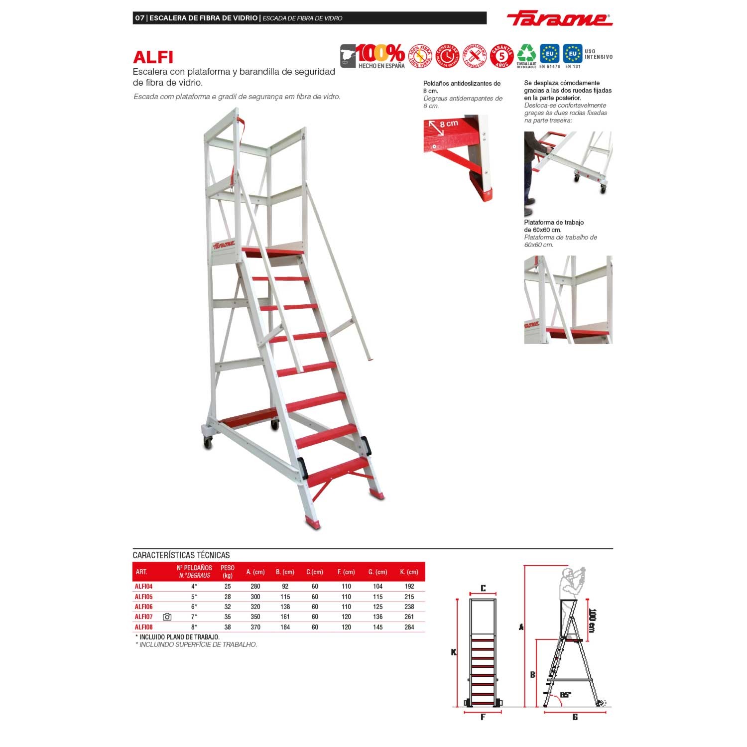 Le modèle ALFI est en fibre de verre et dispose d'une plate-forme de 60x60 cm, de barrières de protection de 1 mètre de hauteur, de mains courantes latérales et de roues fixées à l'arrière pour faciliter le déplacement sur le lieu de travail.