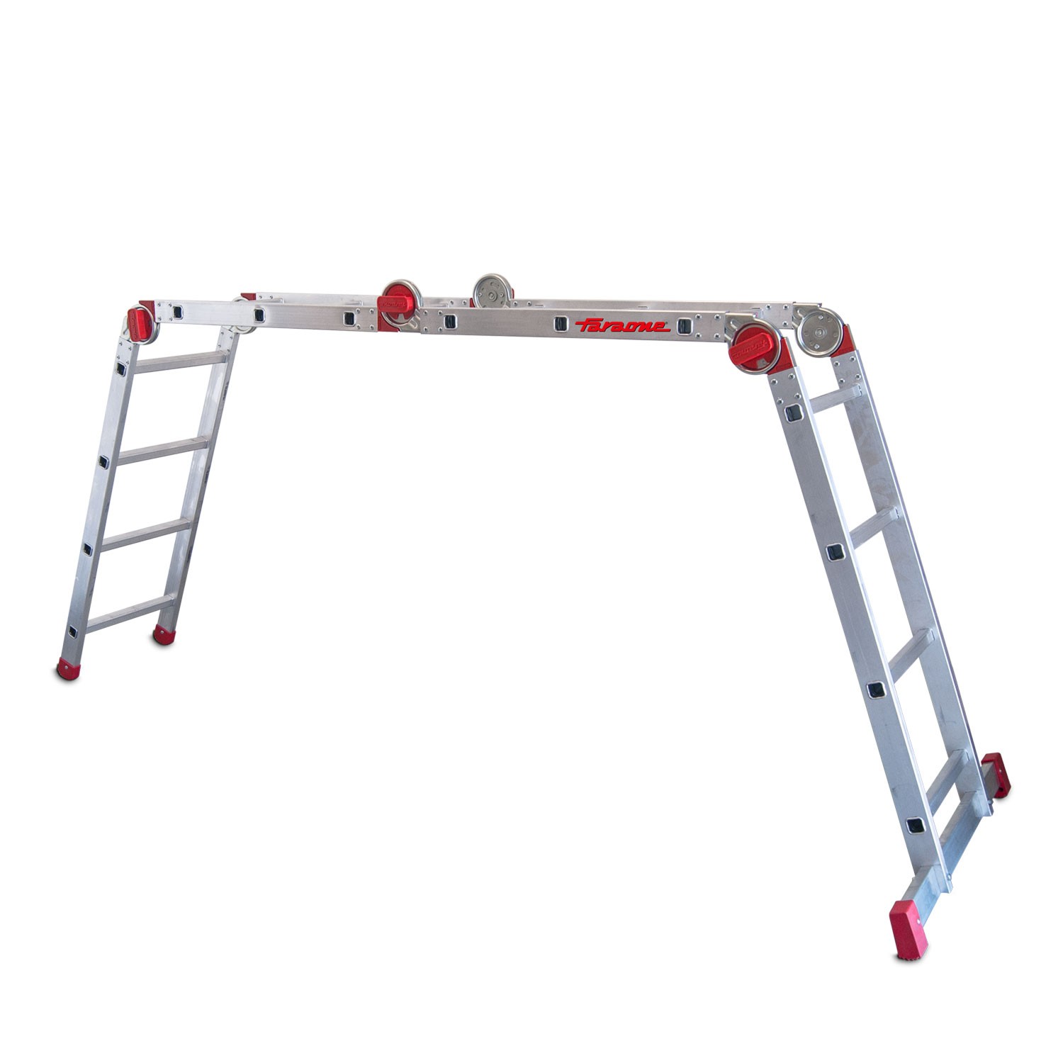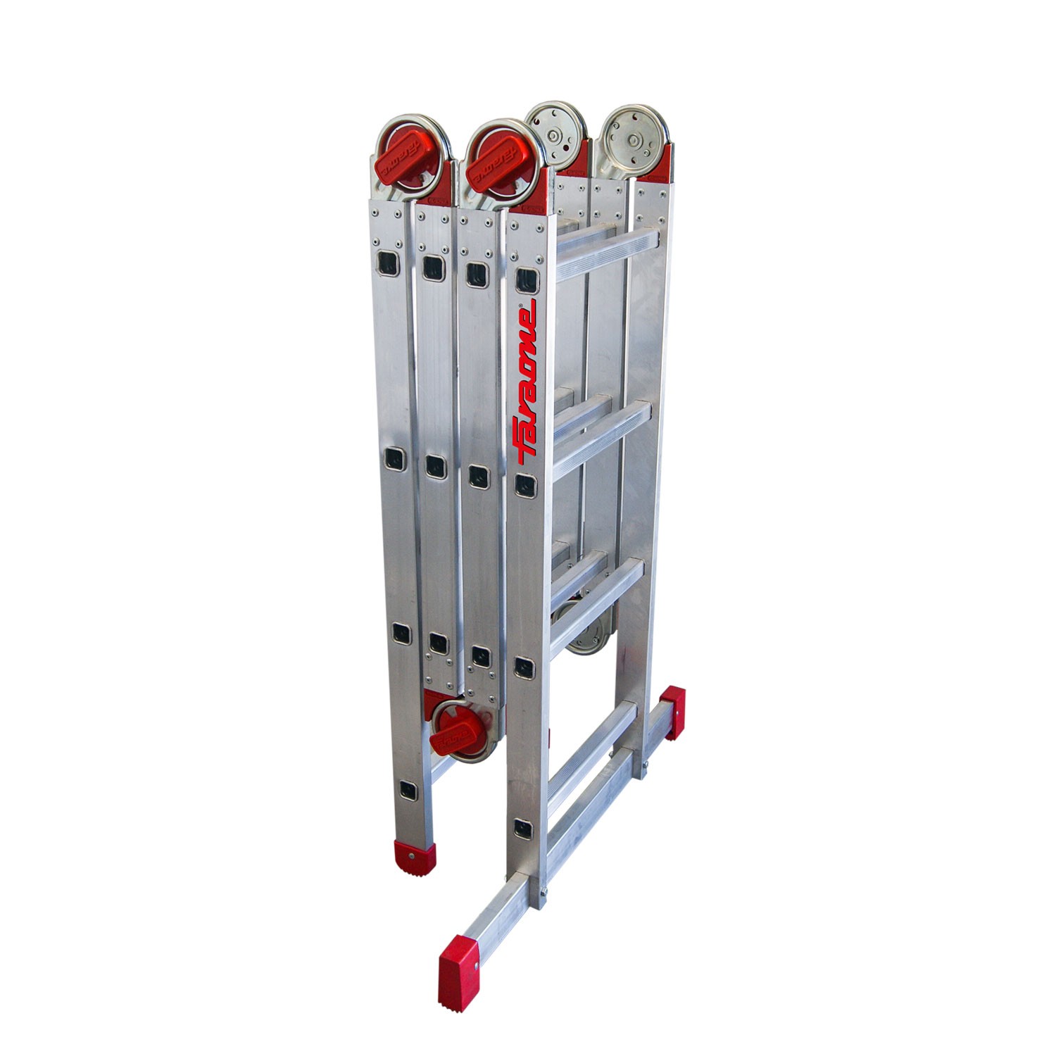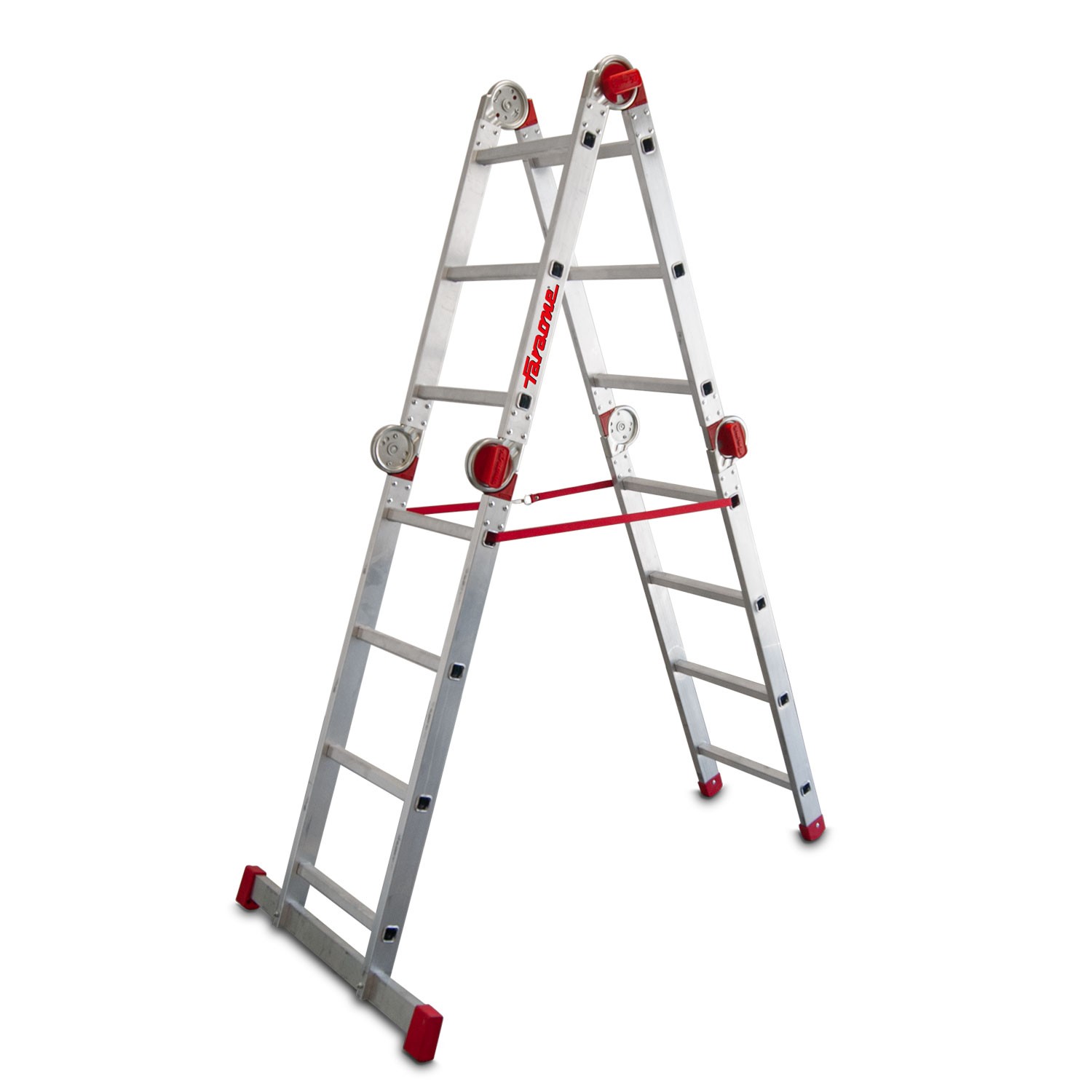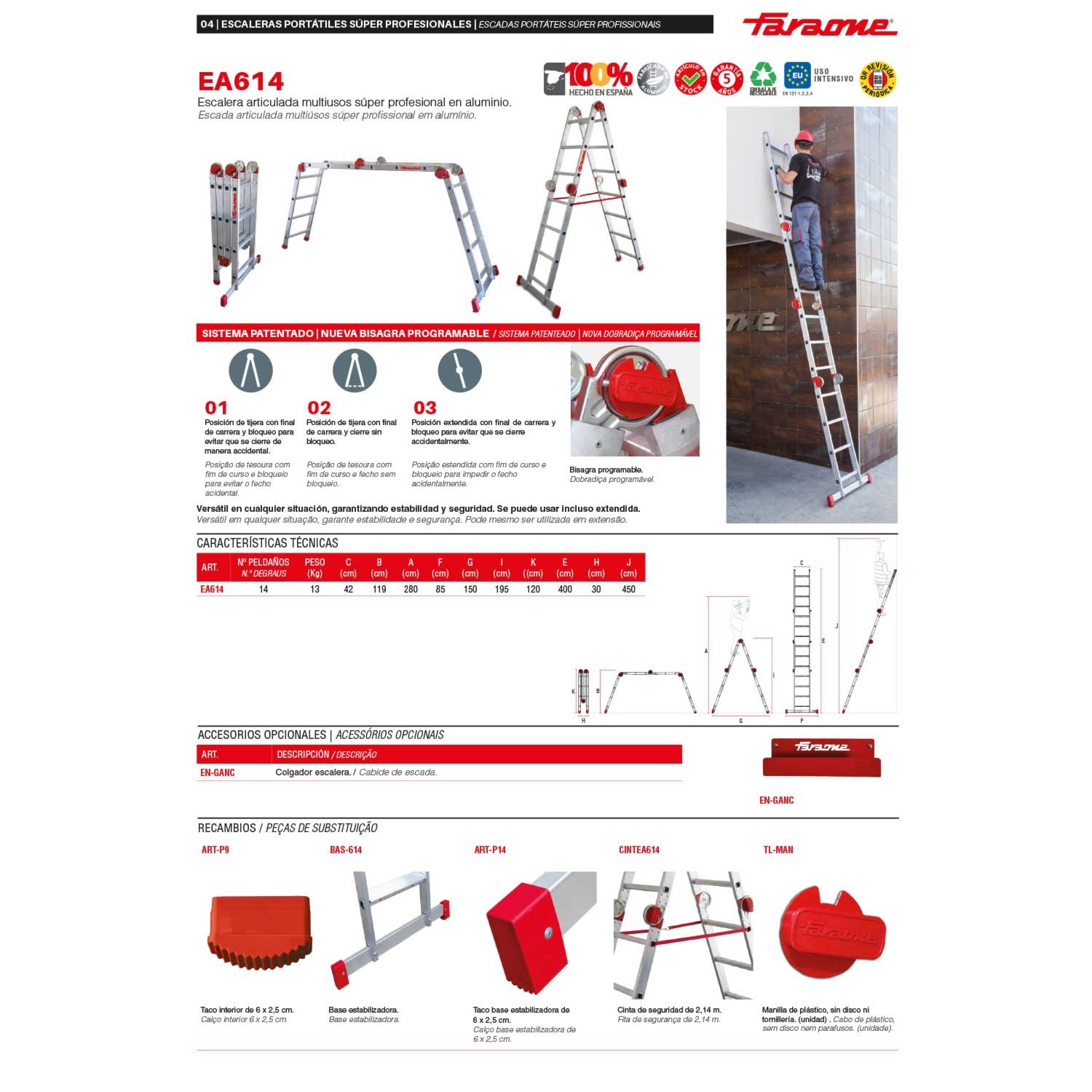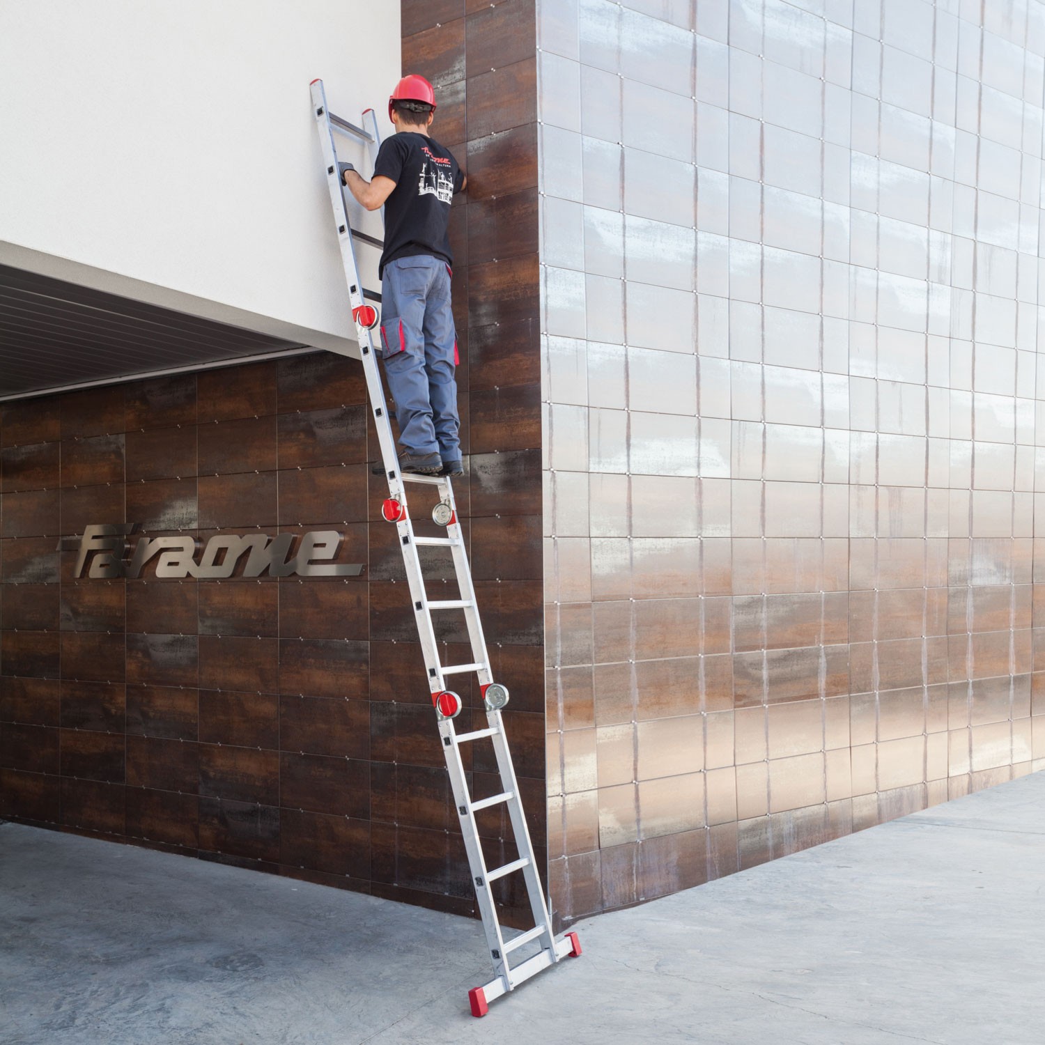 L'échelle EA614 est fabriquée en aluminium et conçue pour permettre de travailler dans trois positions différentes : en escabeau, déployée et en plate-forme.