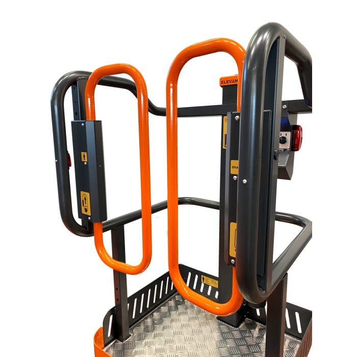 L’Elevah 40B optimise le temps et réduit les efforts des opérateurs. Pour déplacer la machine, il suffit de saisir les poignées et d’appuyer sur les boutons, libérant ainsi les freins et permettant le transport. Une fois positionnée, relâchez simplement les boutons, et la machine freine automatiquement. Une fois en place, accédez à la nacelle et utilisez les commandes pour atteindre la hauteur souhaitée. De cette manière, l’opérateur peut travailler en hauteur sans effort et avec un confort maximal.