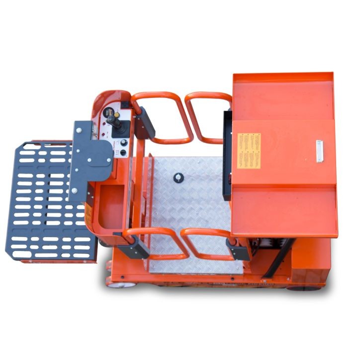 Le plateau de collecte pratique, réglable électriquement et pliable, permet de soulever jusqu’à 100 kg. Elle se distingue par sa compacité (seulement 78x178 cm) et son rayon de braquage nul, permettant à l'opérateur de travailler rapidement et confortablement.