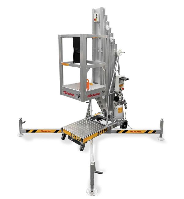 L’Elevah ZP 150 est une plateforme à traction manuelle et élévation électrique qui, selon la configuration choisie, peut atteindre différentes hauteurs de travail, d’un minimum de 7,7 m à un maximum de 16 m. Vous pouvez également choisir entre une utilisation intérieure ou extérieure.