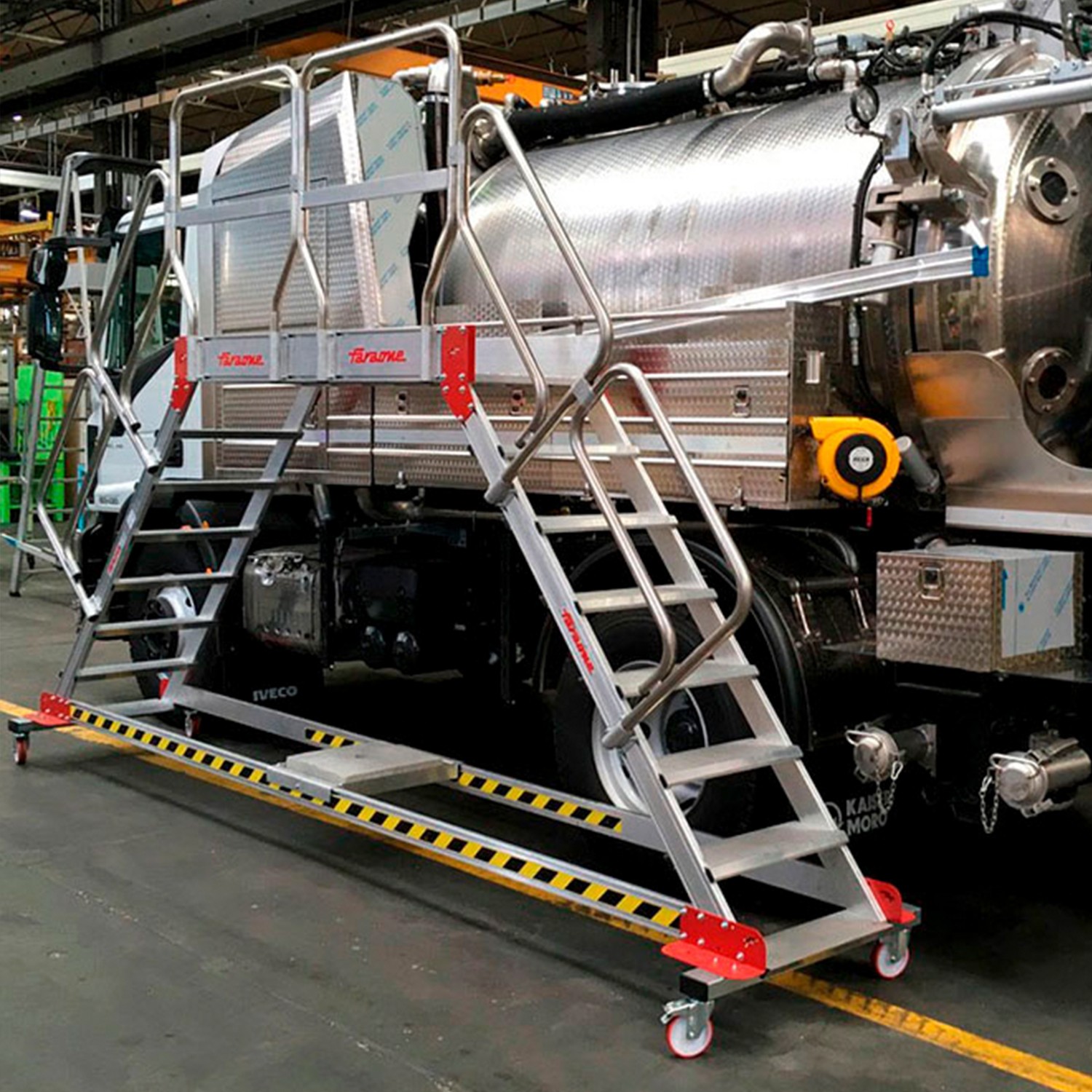 Escalier de type pont avec une vaste surface de travail antidérapante, accès des deux côtés avec de larges marches et des mains courantes de sécurité. Structure légère et robuste entièrement en aluminium.