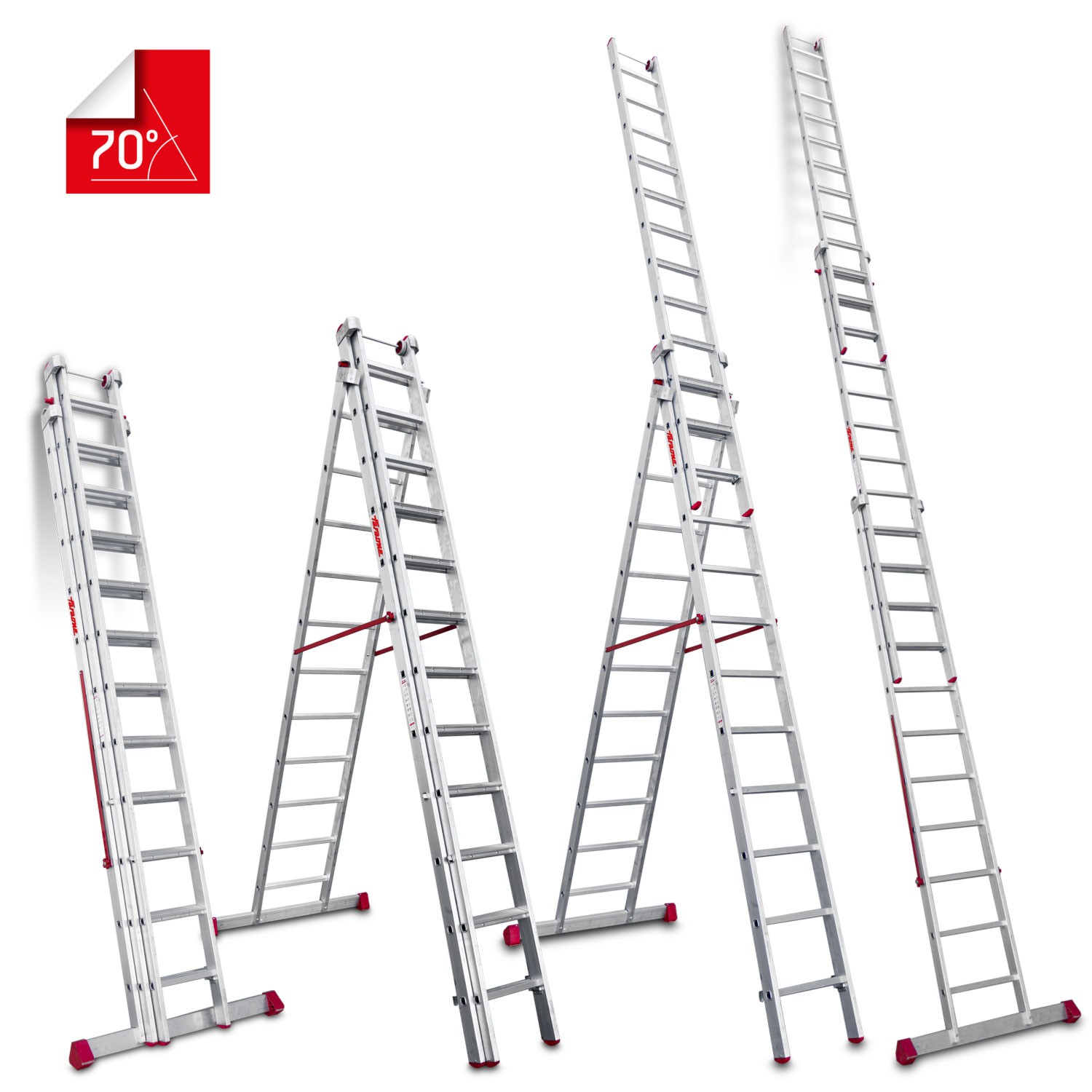Comme il s'agit d'une échelle polyvalente combinée, elle peut être utilisée comme un escabeau à double montée. Les trois sections peuvent être prolongées afin de l'utiliser comme une échelle murale. Elle peut également être placée sur des sols en dénivelé, ce qui permet de l'utiliser sur des sols tels que les trottoirs ou des escaliers.
