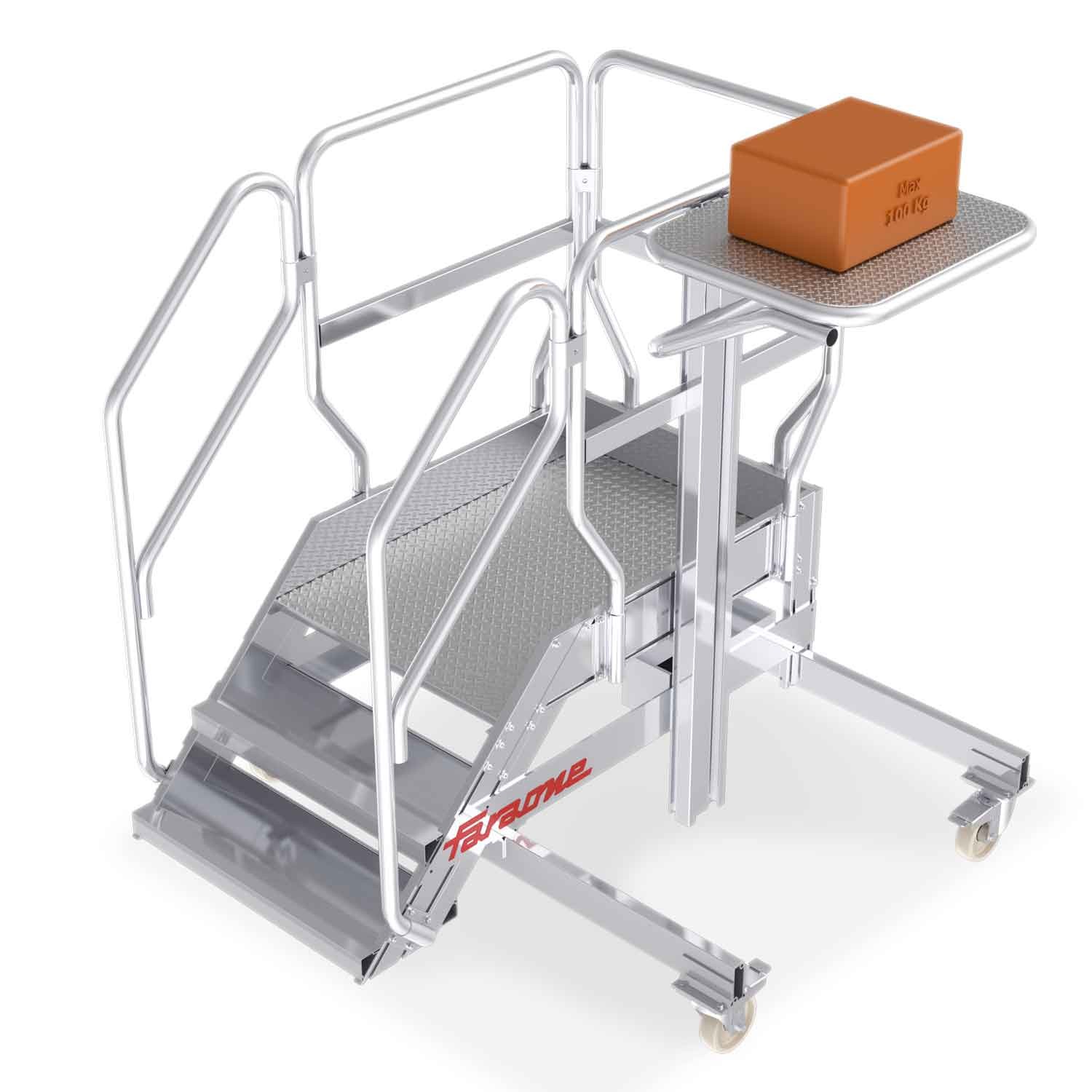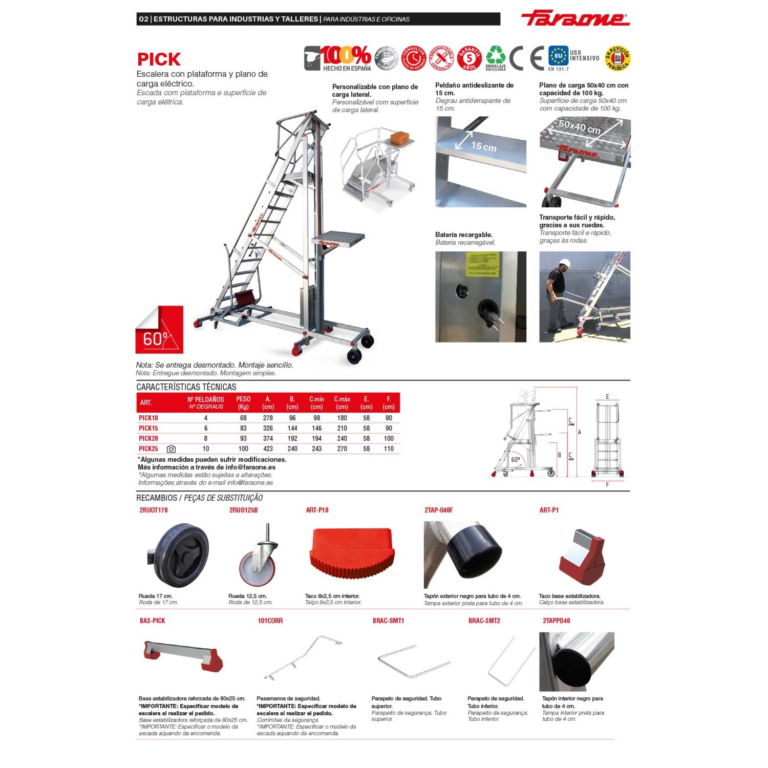 L'échelle PICK est en aluminium et équipée d'une plate-forme de travail et d'une surface de chargement à commande électrique. Elle est conçue pour les industries, les ateliers et les entrepôts, car la plate-forme permet de travailler en hauteur et la surface de travail actionné par un système électrique permet de soulever des paquets et des colis afin de les entreposer dans les rayonnages.