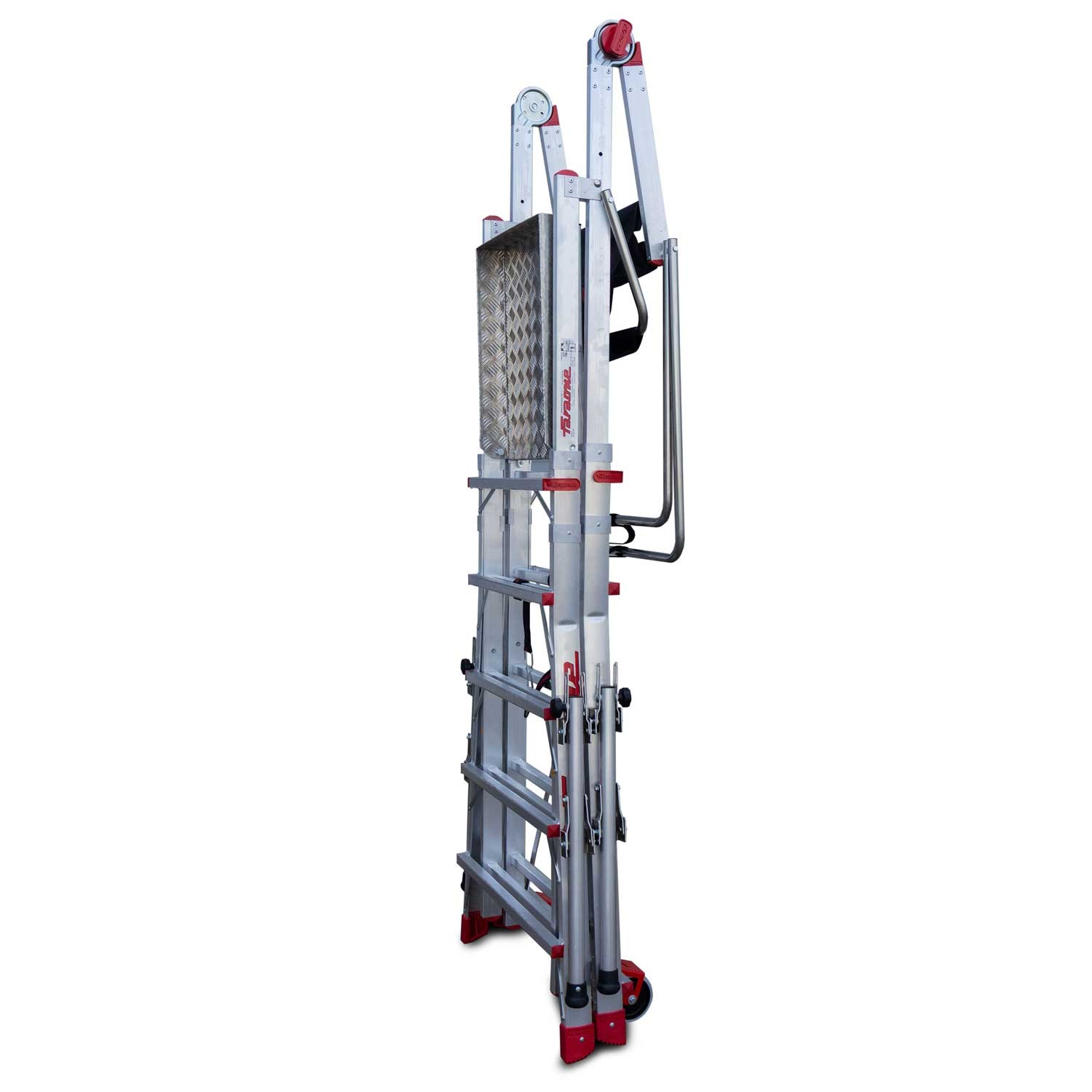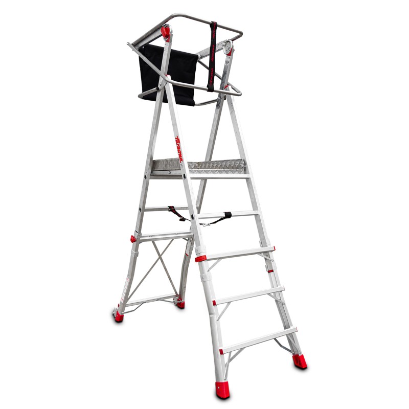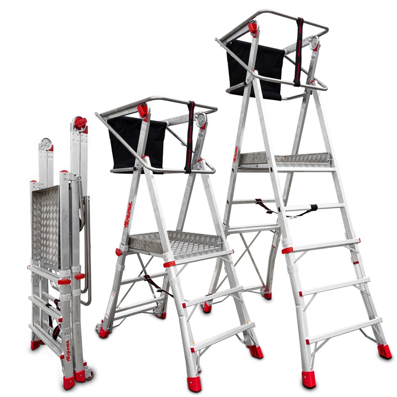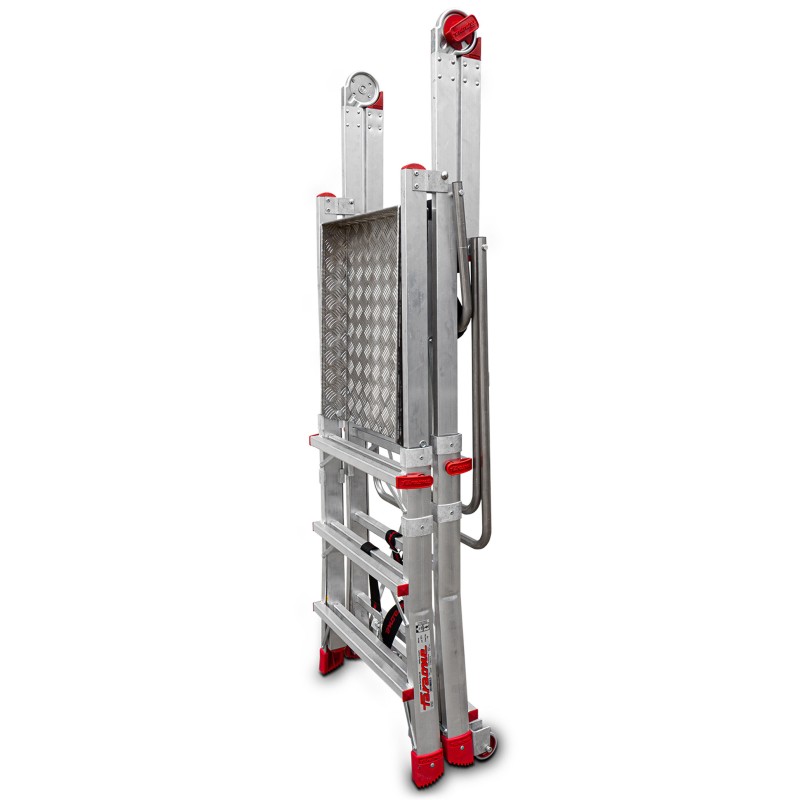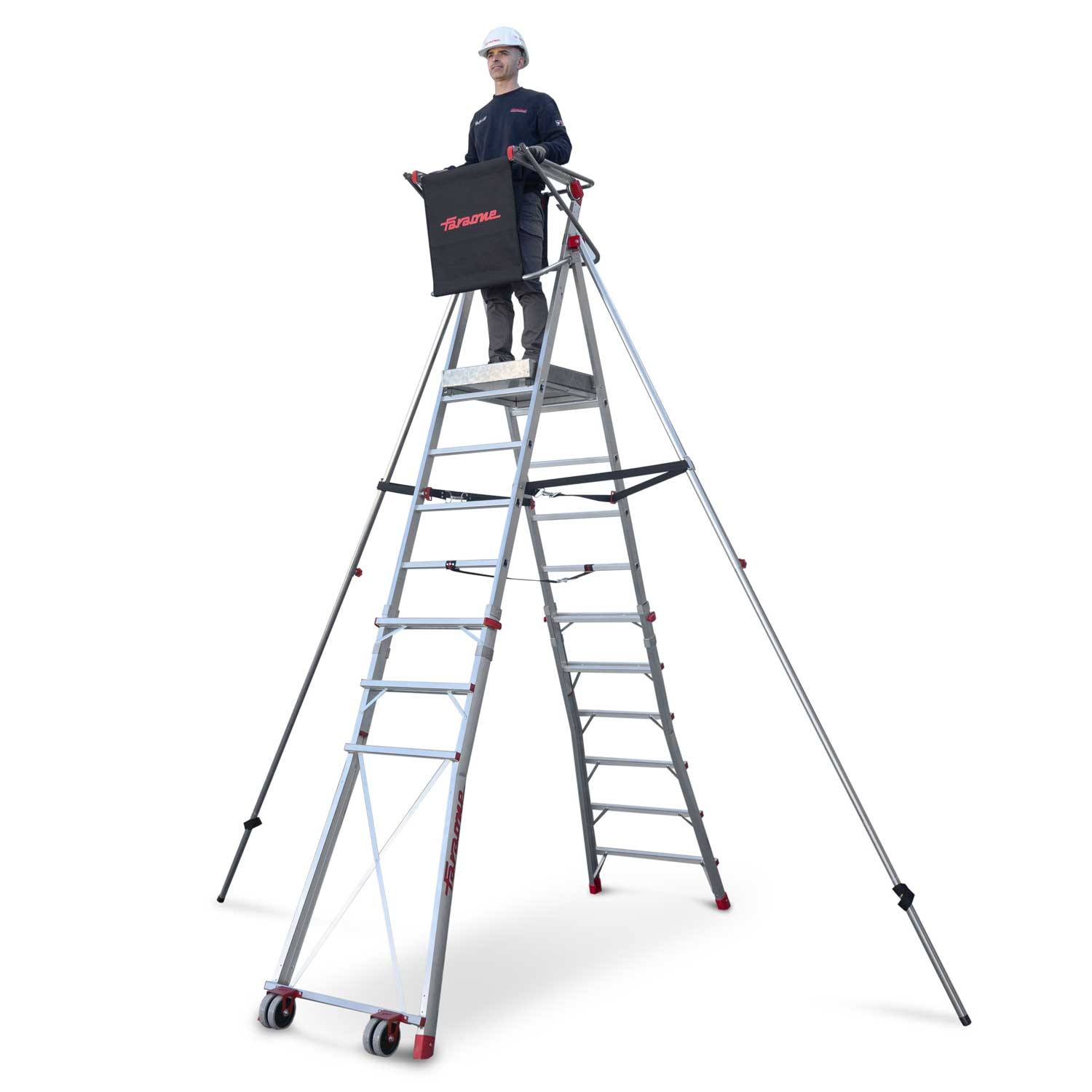 La PLS est une échelle pliante et réglable en hauteur, dotée de doubles roues et d'une vaste surface de travail antidérapante de 52x62 cm offrant un accès par une échelle à marches antidérapantes de 3 cm de profondeur.