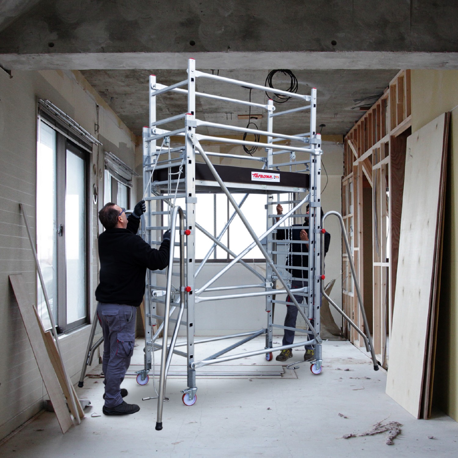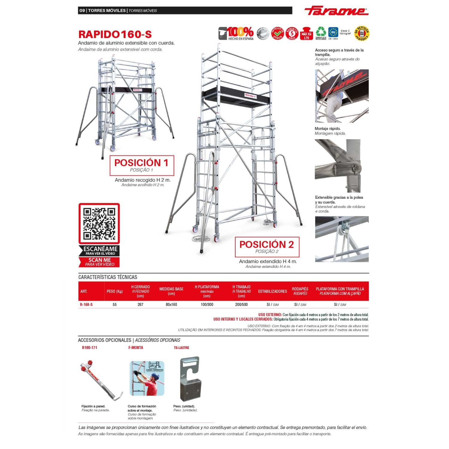 Le principal avantage de ce produit est sa maniabilité et sa facilité de montage. Les sections qui le composent soulèvent simultanément la plate-forme et les barrières en un seul mouvement, pour atteindre la hauteur souhaitée sans avoir à monter et démonter les pièces.