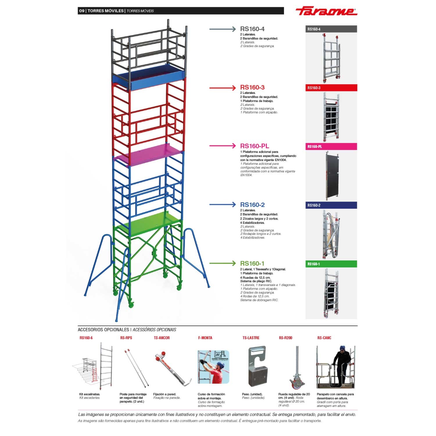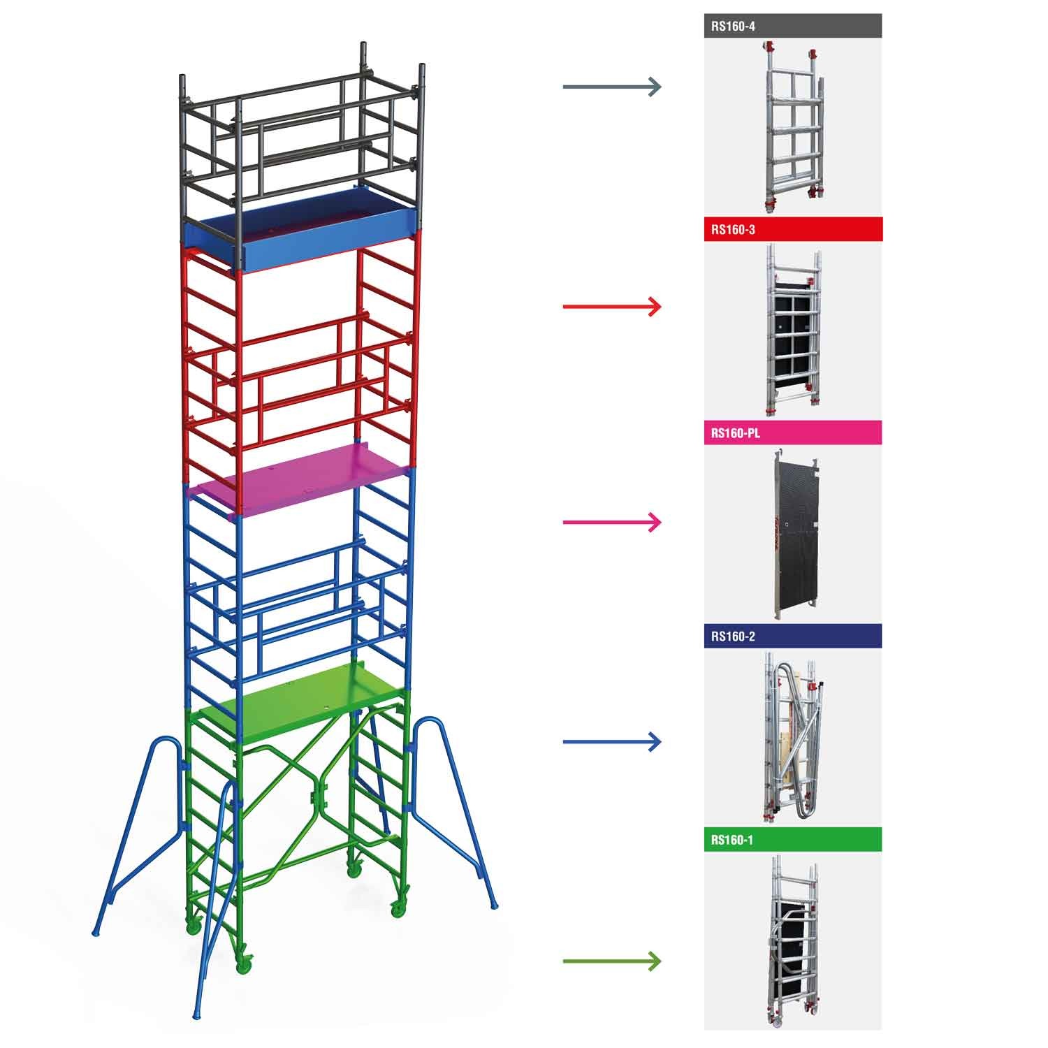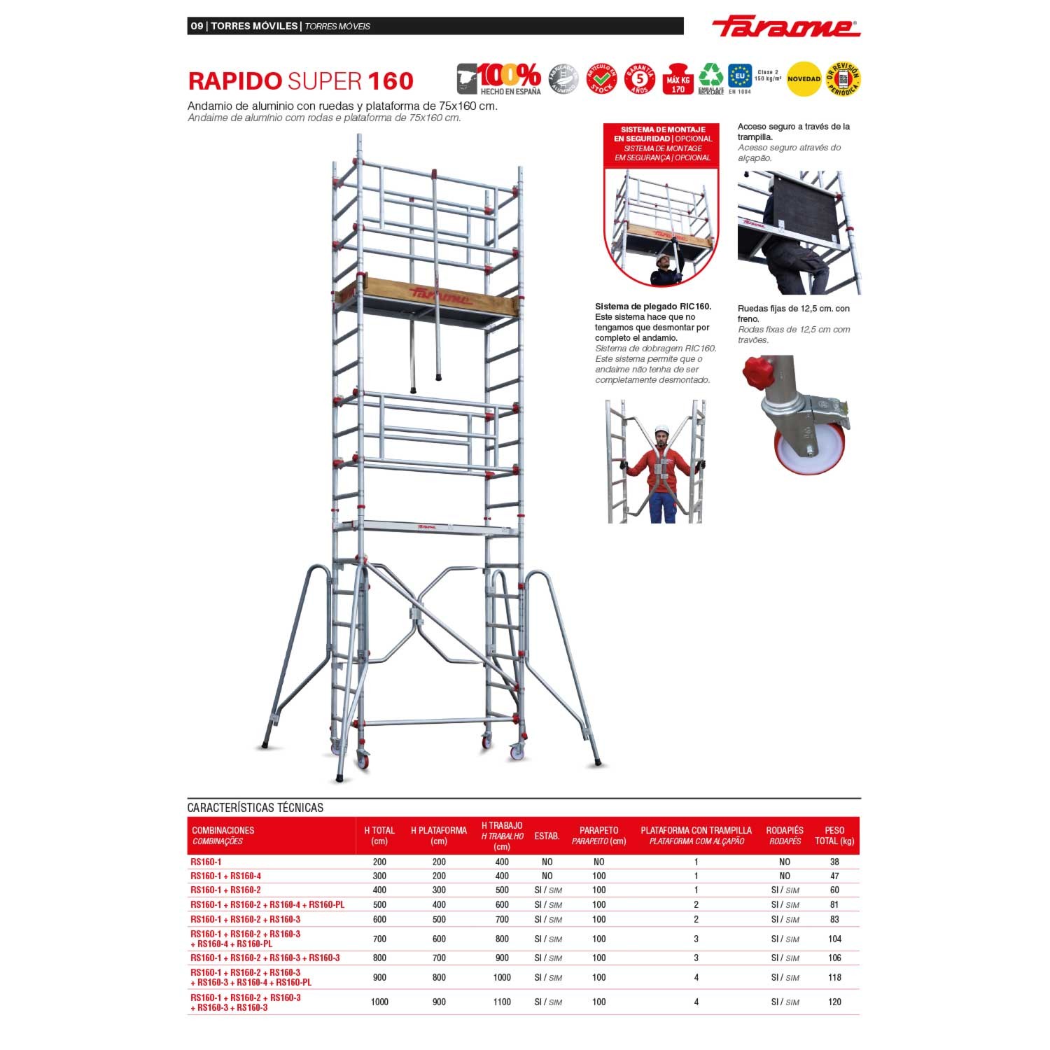 El Andamio RAPIDO SUPER 160 incluye contrapesos opcionales de hierro, que se añaden para mejorar la estabilidad en alturas superiores. Además, el sistema de montaje en seguridad opcional RS-RPS garantiza un montaje seguro y fiable.