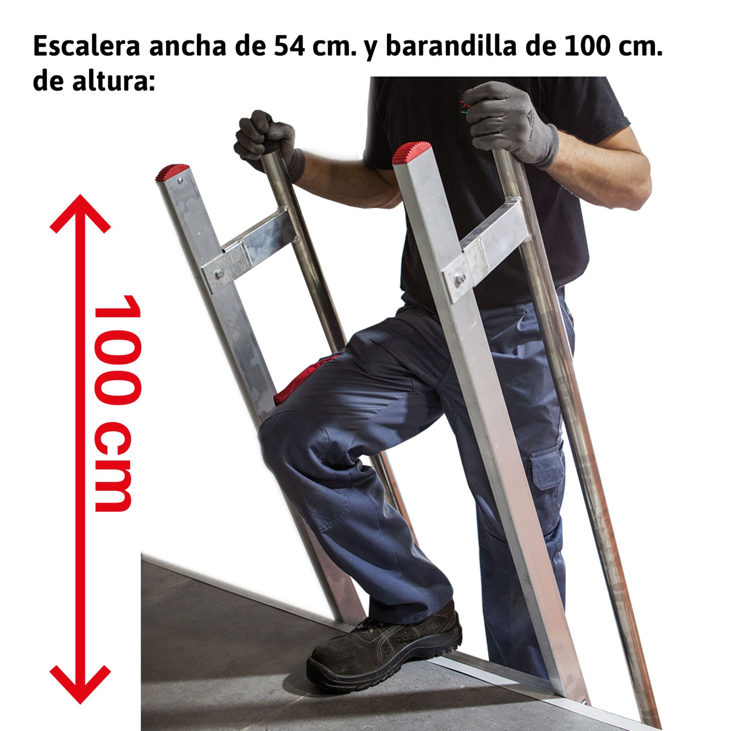 Elle est dotée de marches antidérapantes de 8 cm et d'une inclinaison de 70° qui garantit une montée confortable. Grâce aux mains courantes latérales et à la barrière de sécurité de 100 cm de hauteur sur la partie supérieure, l'atterrissage est confortable et sûr.