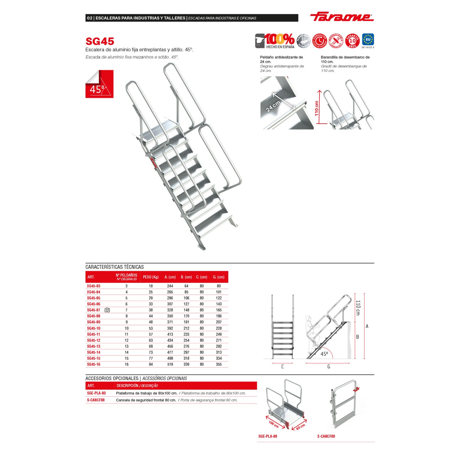 La SG45 est une échelle en aluminium ancrée au sol permettant d'accéder de manière confortable et sûre aux mezzanines ou aux planchers mezzanines de structures industrielles.