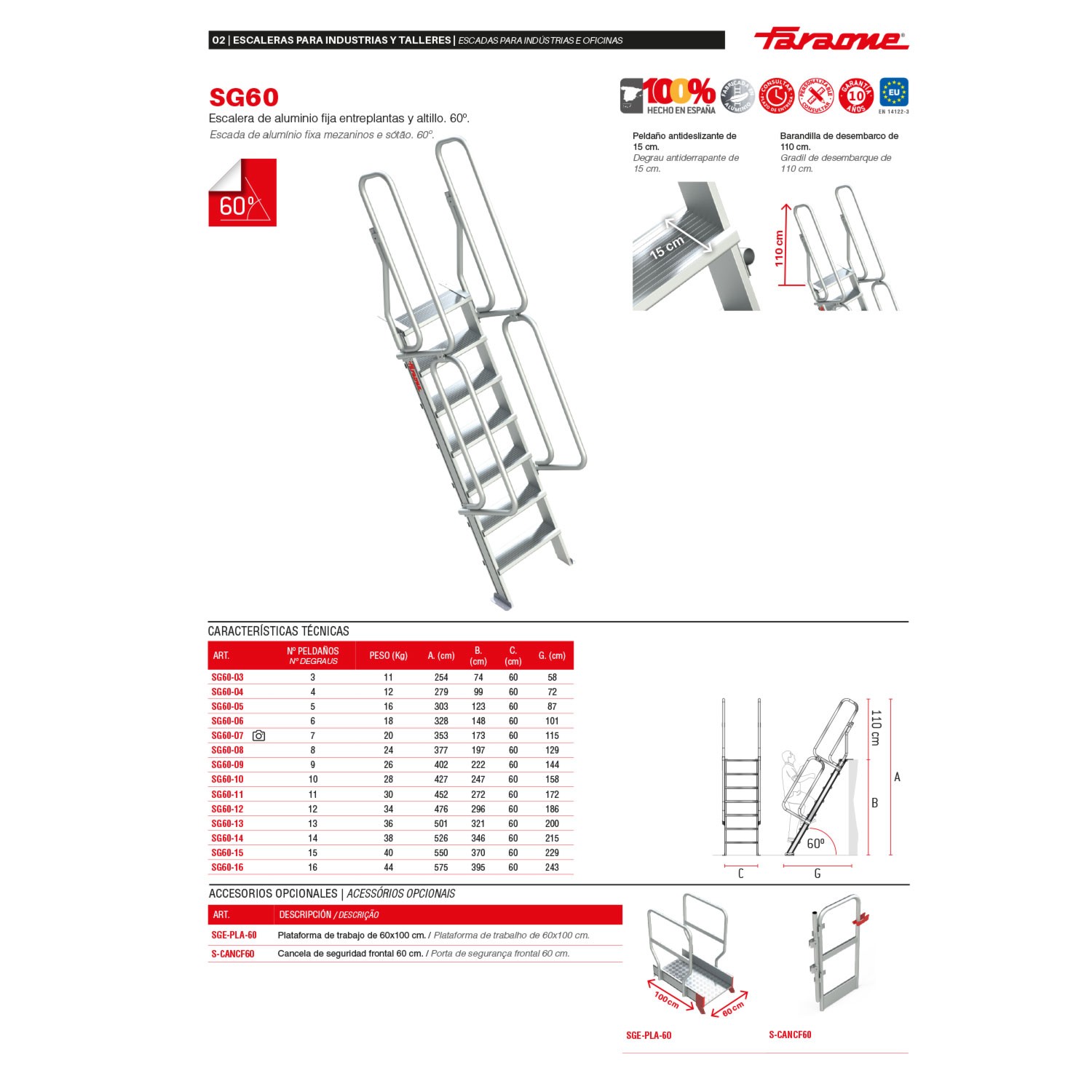 La SG60 est une échelle fixe en aluminium permettant d'accéder de manière confortable et sûre aux mezzanines ou aux planchers mezzanines de structures industrielles.