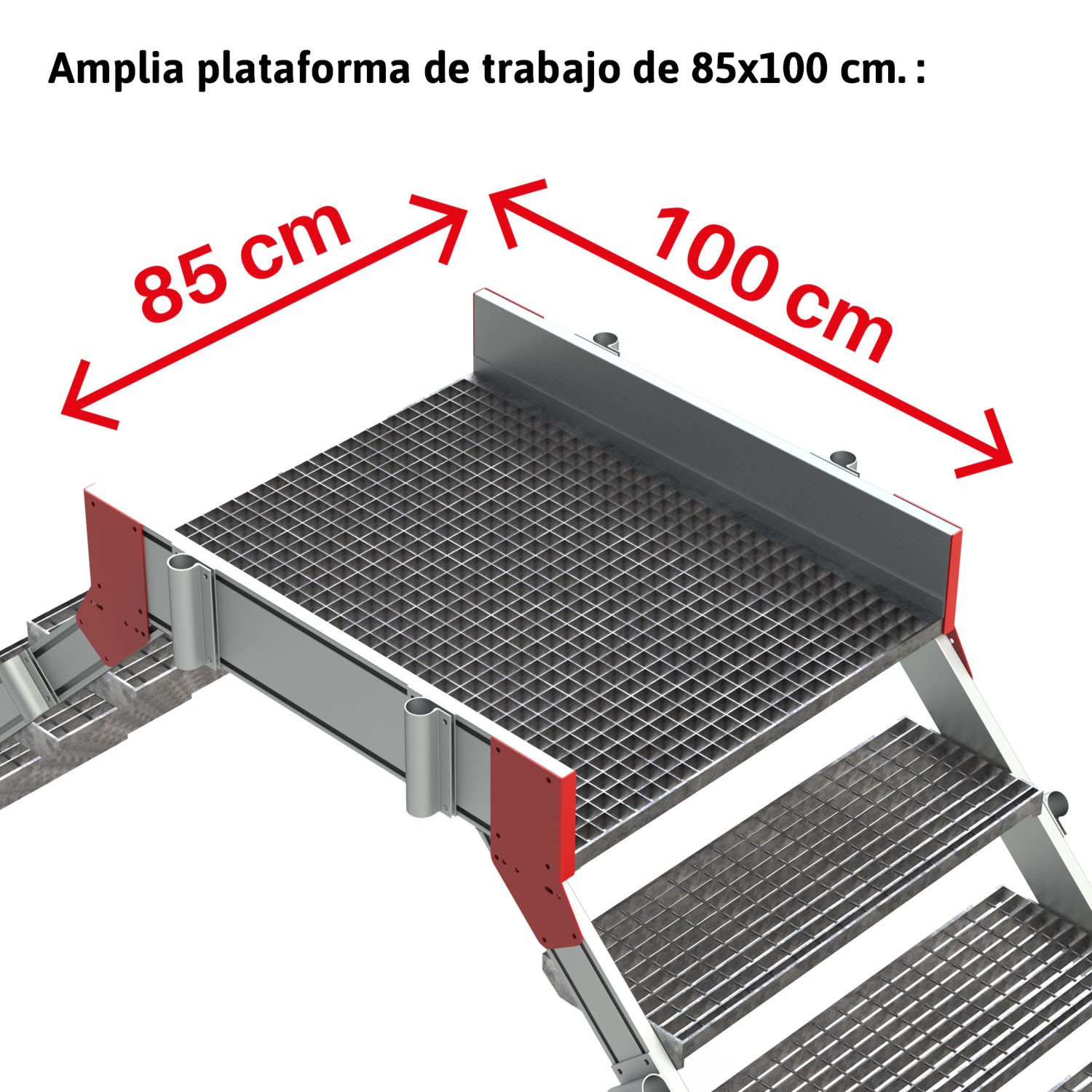 Le SP-T est un escalier à double montée équipé de roues, d'une vaste surface de travail antidérapante de 85x100 cm en caillebotis électrosoudé (Tramex), d'un accès par deux escaliers inclinés à 45°, de marches antidérapantes de 27 cm de profondeur en Tramex et de mains courantes des deux côtés.