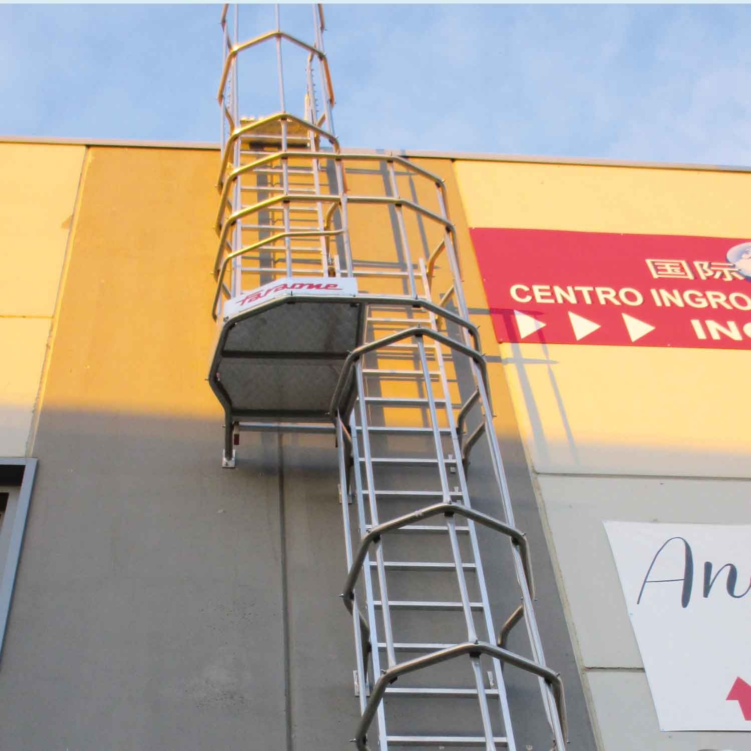 La SVS1 est une échelle de sécurité verticale ou échelle à crinoline, dotée d'une cage de protection et de plates-formes faisant office de paliers, positionnées tous les 6 mètres, conformément à la norme EN 14122-4.