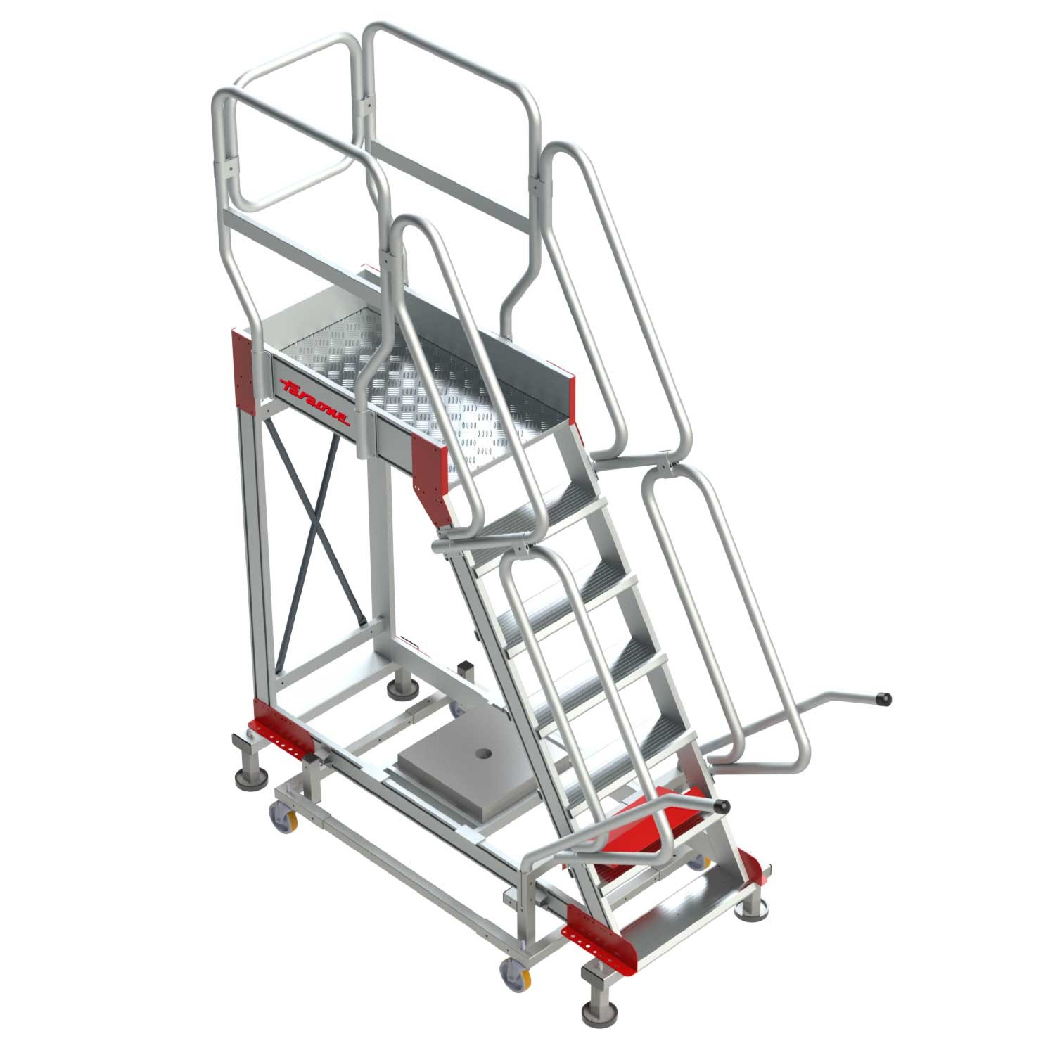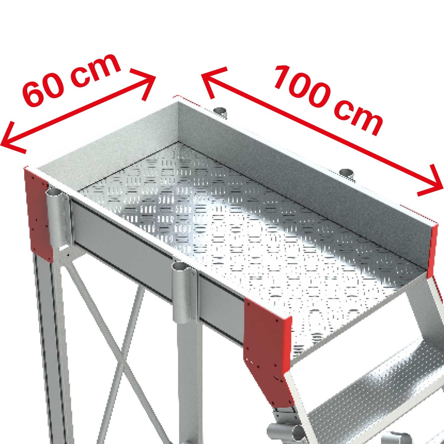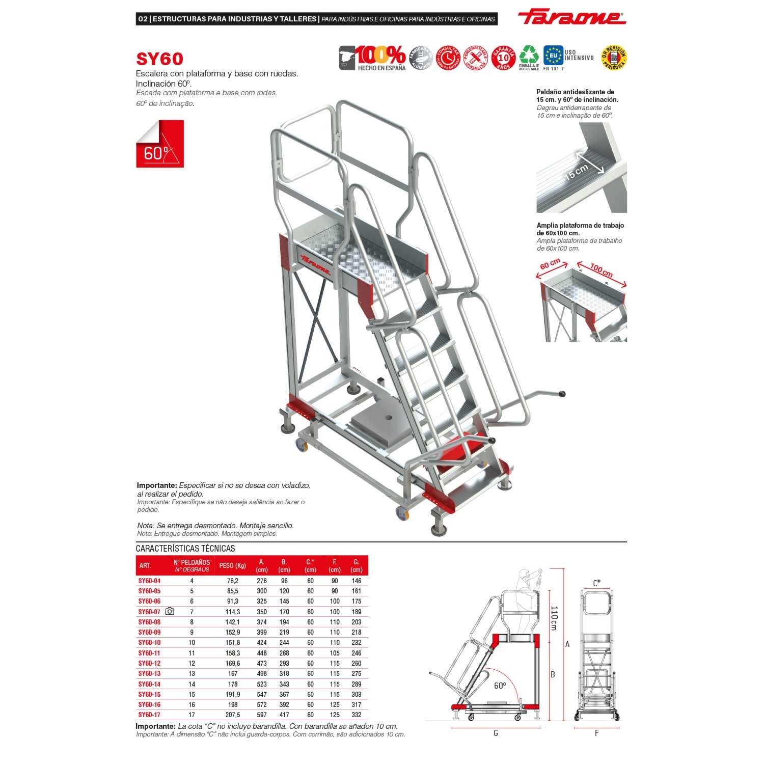Le SY60 est un escalier sur roues doté d'une vaste surface de travail antidérapante de 60x100 cm offrant un accès par un escalier incliné à 60° avec des marches antidérapantes de 15 cm de profondeur et des mains courantes des deux côtés.