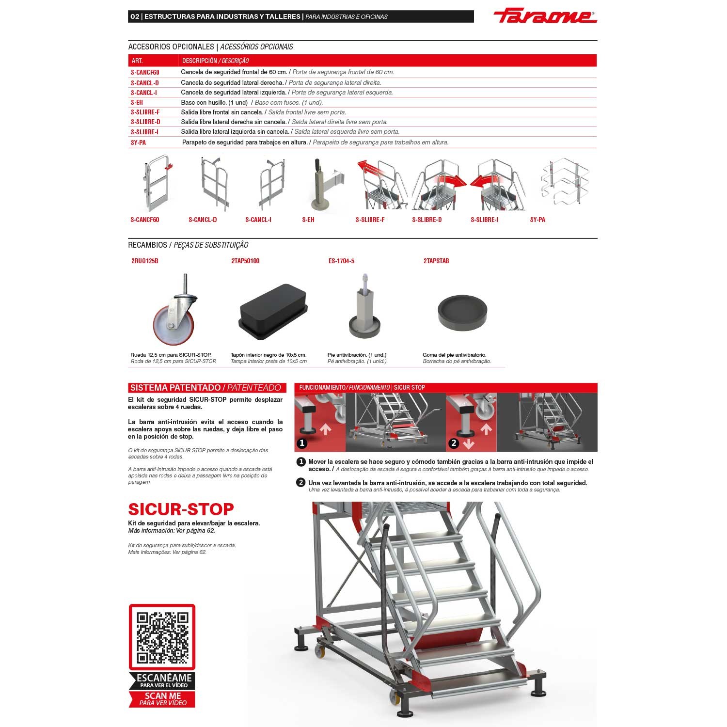 Comprend le système breveté SICUR STOP, un kit de sécurité qui permet de déplacer l'escalier sur ses quatre roues. La barre anti-intrusion évite tout accès lorsque l'escalier est appuyé sur ses roues et dégage le passage dans la position d'arrêt.