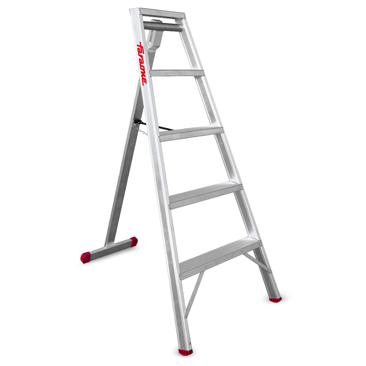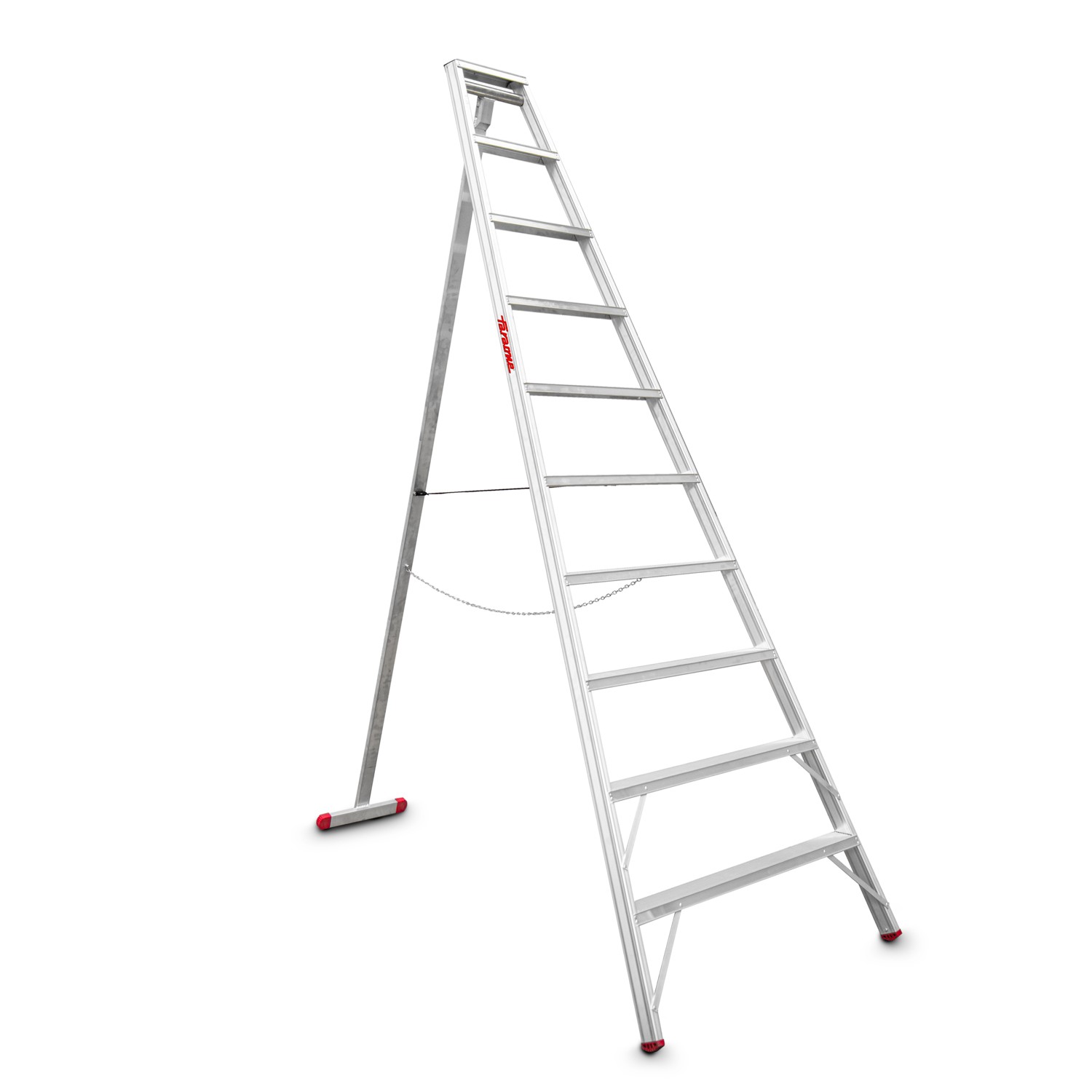 L'escabeau T700 est conçu spécialement pour travailler sur les terrains sablonneux ou irréguliers, avec des marches spéciales antidérapantes de 8 cm de profondeur, une section conique avec stabilisateur frontal articulé, des patins antidérapants et une pointe individuelle en option pour fixer l'échelle au sol.