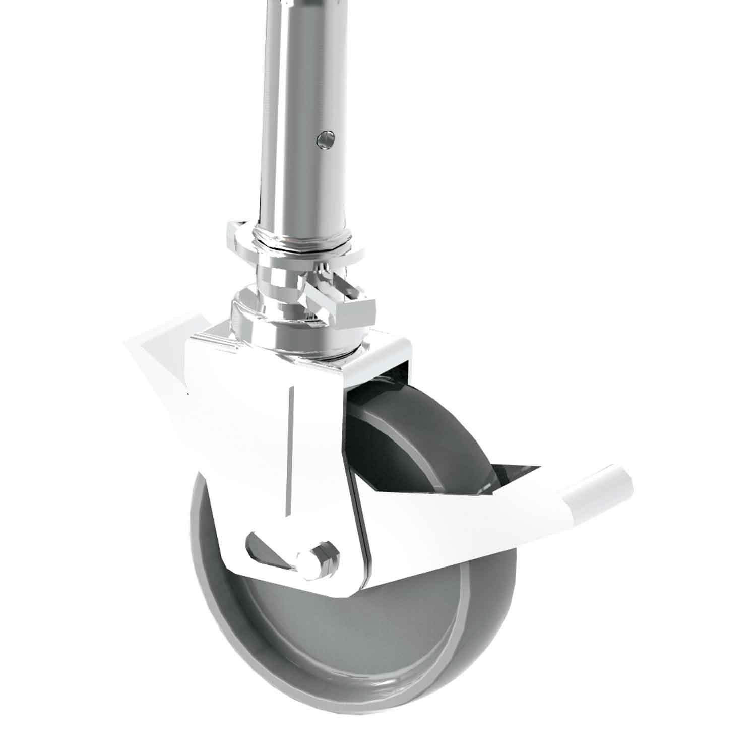 Roues pivotantes de 200 mm avec frein, réglables en hauteur.