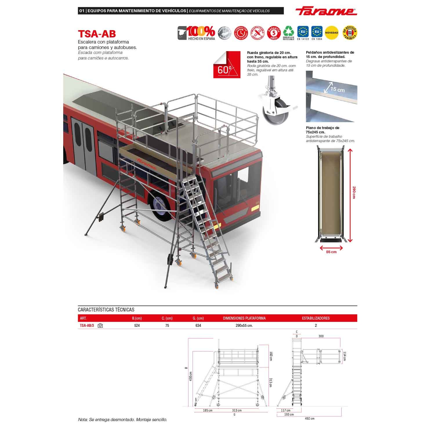 Le TS-AB est l’équipement le plus sûr du marché pour effectuer l’entretien de la carrosserie des autobus. Ce produit est conforme aux normes européennes EN 14122 et EN 1004, et est livré avec un certificat de conformité. La charge maximale supportée est de 150 kg. Il est entièrement démontable et peu encombrant, ce qui facilite son rangement.