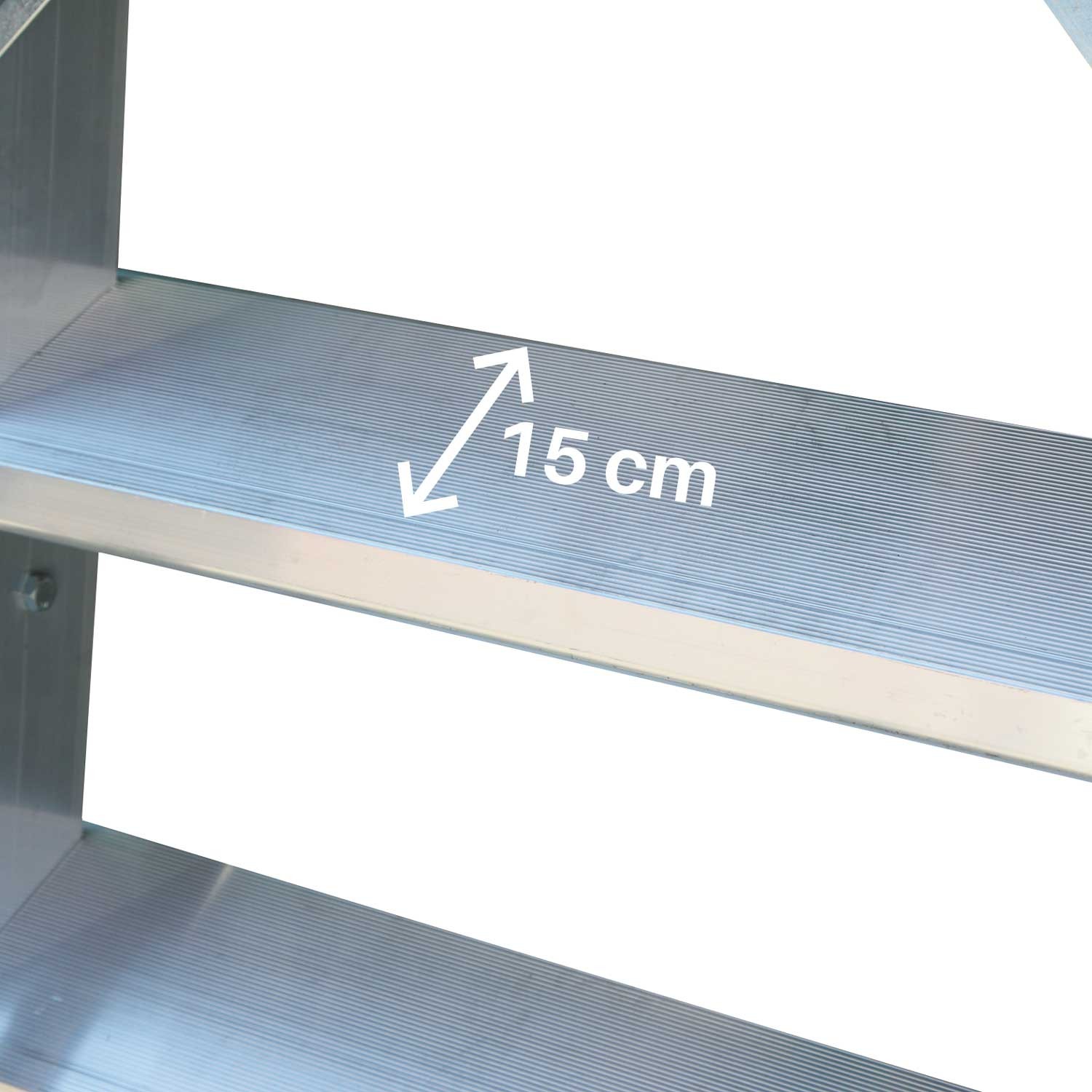 Accès sécurisé à la passerelle par une échelle inclinée à 60° avec marches antidérapantes de 15 cm de profondeur.