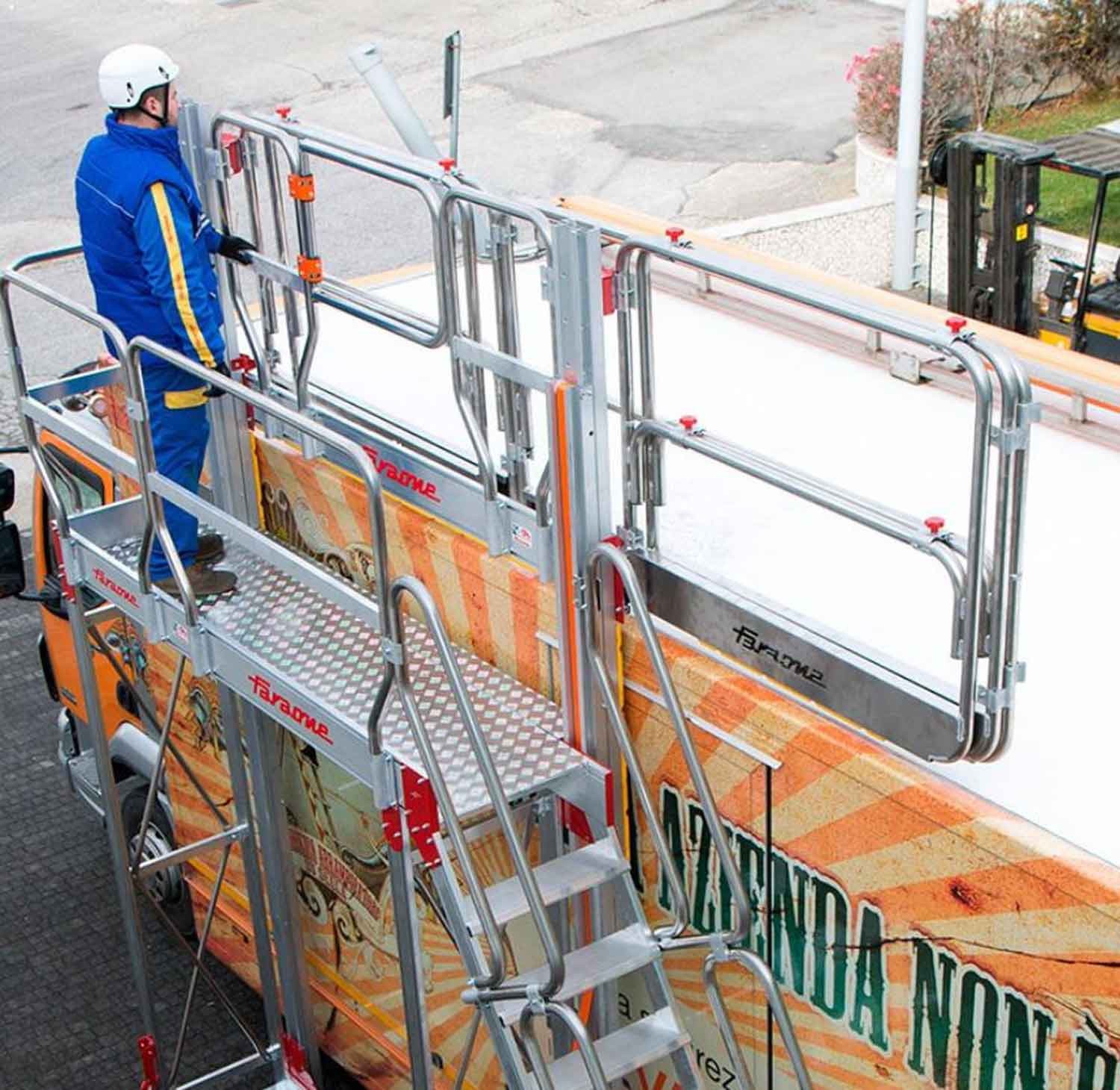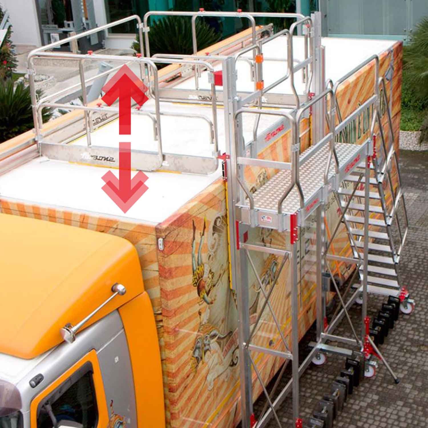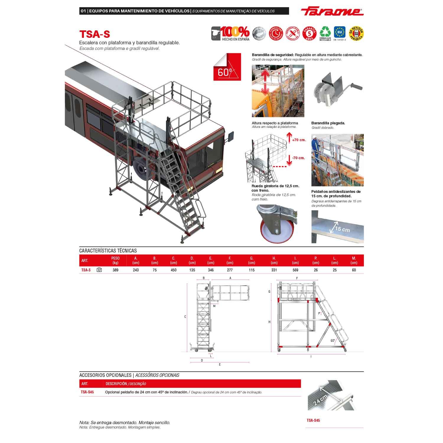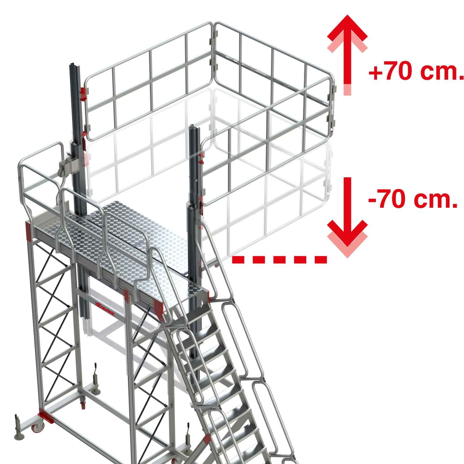 La TSA-S est une échelle avec plate-forme et système de barrières de protection réglable en hauteur au moyen d'un système de poulies, conçu pour effectuer des travaux de maintenance sur des véhicules de grande envergure, des réservoirs, des silos, etc.